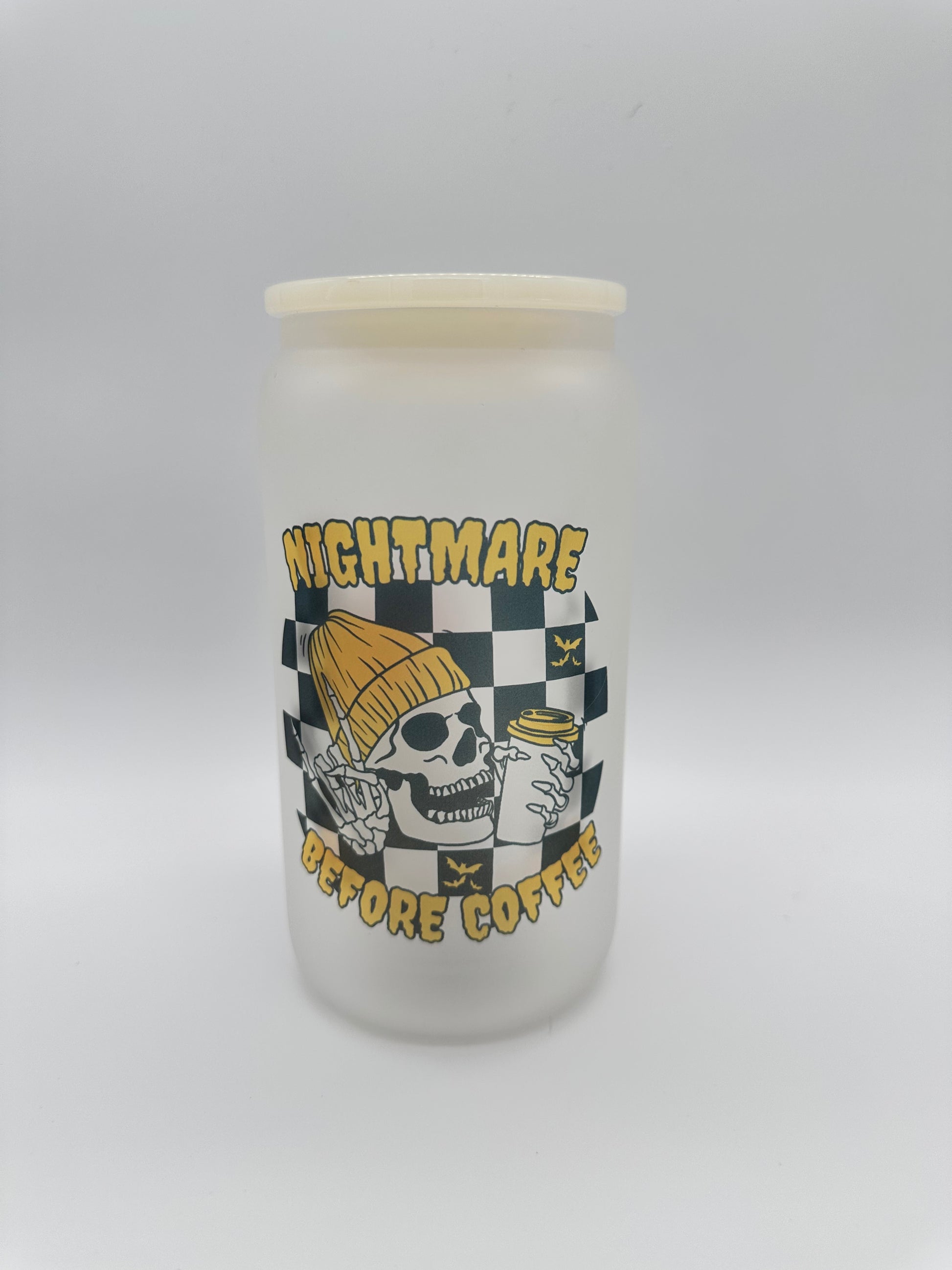 Nightmare Before Coffee Checkered Skeleton Glass Cup -16oz with lid + straw! Sublimation